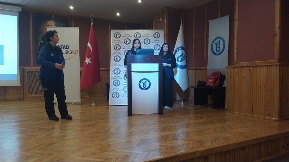Disaster awareness training was organized for students of the Faculty of Health Sciences at Bartın University. The training, held on April 13, 2026, in the Conference Hall of the Ağdacı Campus, was given by AFAD (Disaster and Emergency Management Presidency) personnel.